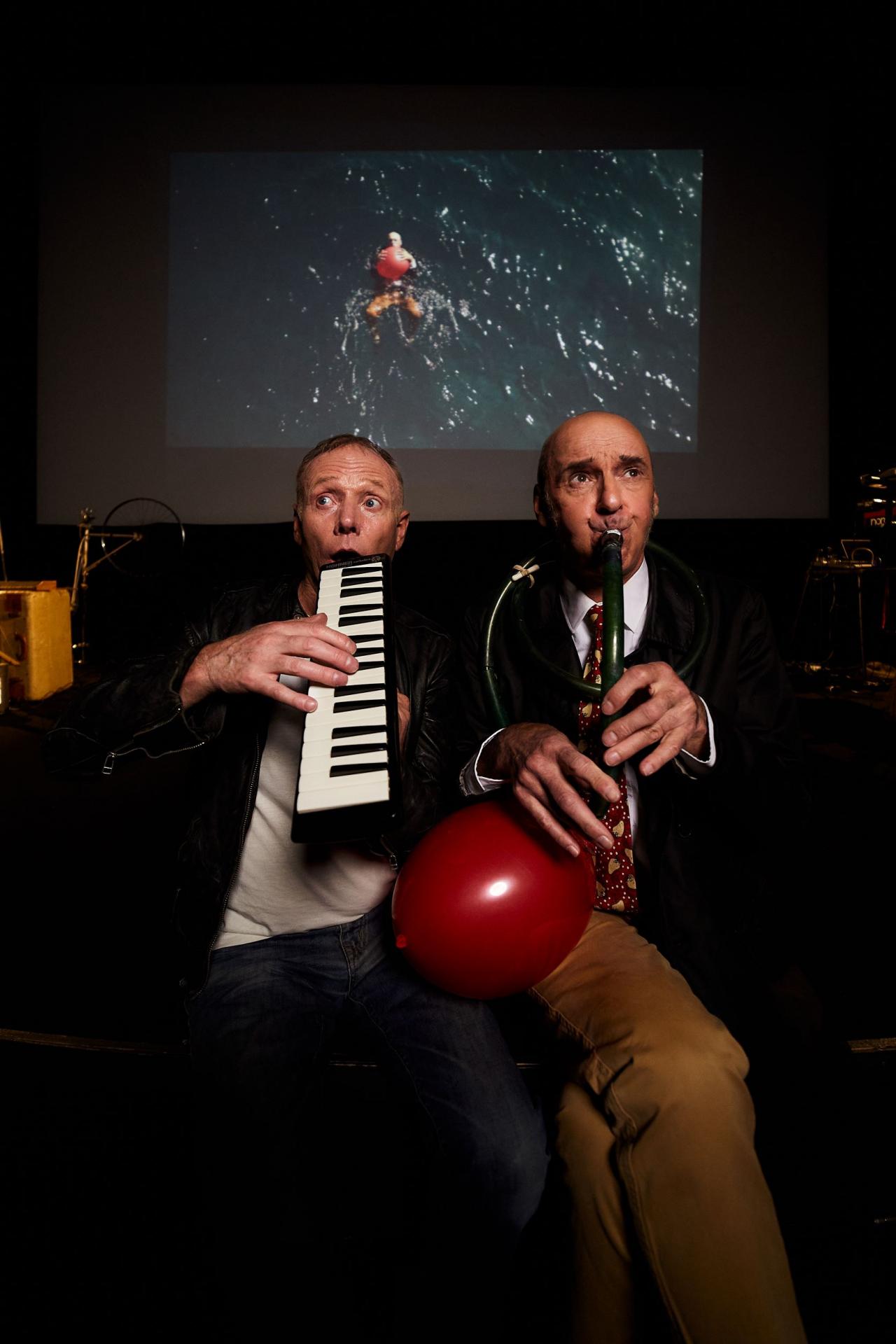 Rompus à l’humour musical depuis 30 ans avec le groupe Zic Zazou, Jean-François Hoël et Hervé Mabille approfondissent le concept expérimenté dans Cinéklang, leur précédent spectacle : s’amuser à changer l’accompagnement musical d’une séquence et à en transformer le sens. Mais ils excellent aussi sur un autre terrain, celui du jeu d’acteur.La cinéaste Christine François qui a réalisé les films, a également signé la mise en scène. Les histoires projetées de notre duo, comiques et poétiques, se prolongent sur le plateau et s’emboîtent comme les pièces d’un puzzle. Il y a du Queneau et de l’Oulipo dans ce spectacle vivant. Les références sont nombreuses : Kaurismaki, Spielberg et Tati pour les personnages, Méliès pour l’inventivité, les trucages, l’utilisation d’objets sonores et le théâtre d’ombres, Demy et Legrand pour la comédie musicale, sans compter les nombreux hommages à nos BOs préférées.
