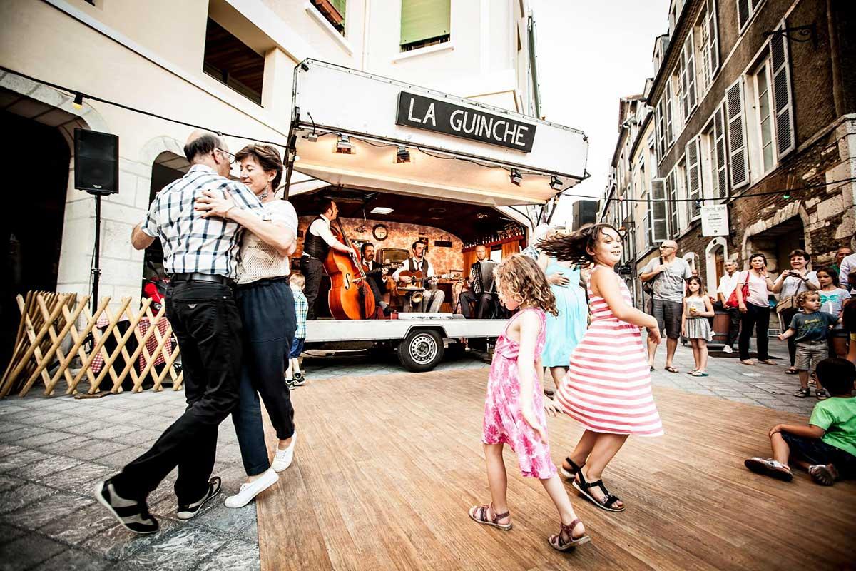 Gouaille rétro, effervescence joyeuse, l’esprit du bal musette, des flonflons et du swing manouche revit grâce à la Guinche, ce quatuor qui déménage !