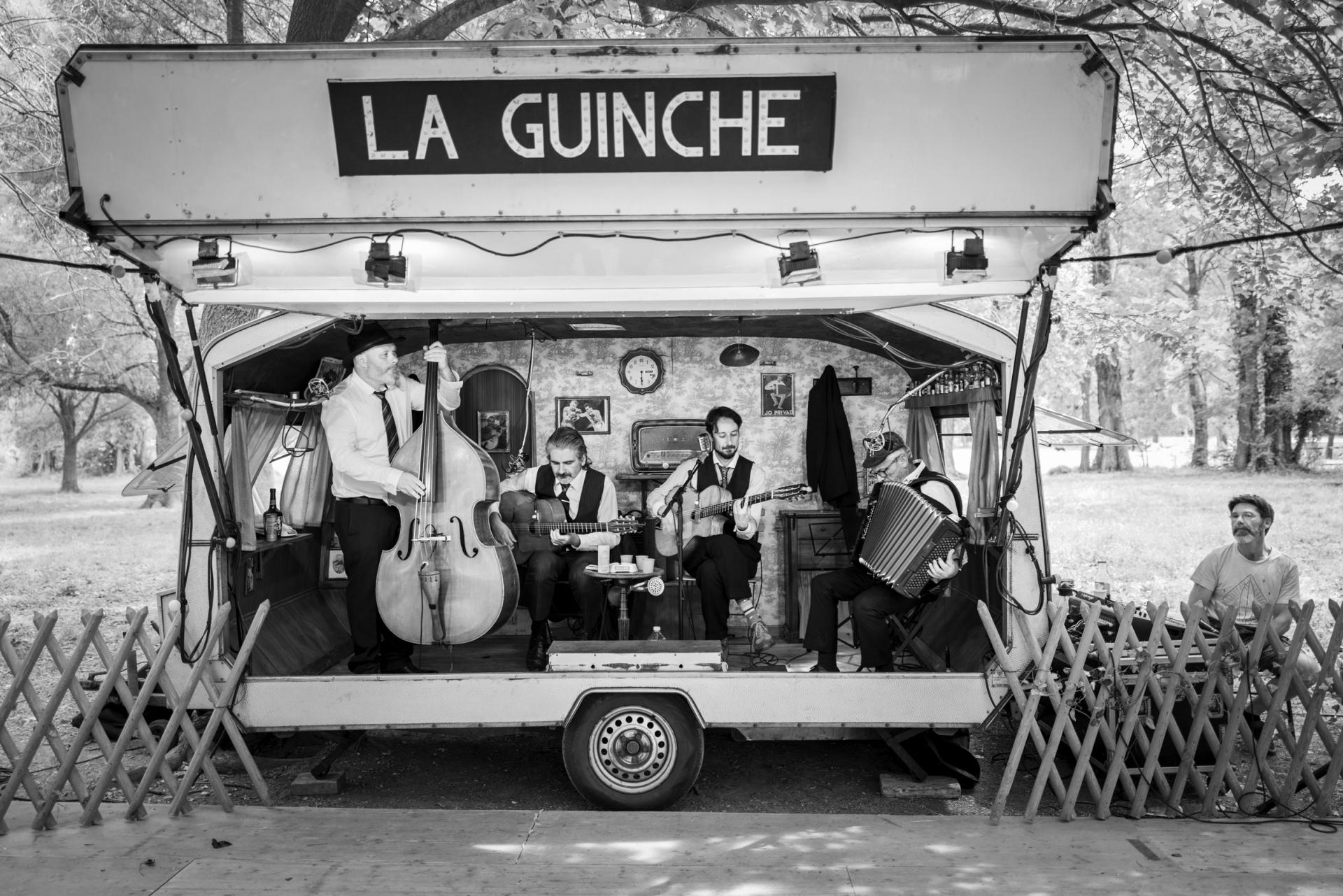 Gouaille rétro, effervescence joyeuse, l’esprit du bal musette, des flonflons et du swing manouche revit grâce à la Guinche, ce quatuor qui déménage !