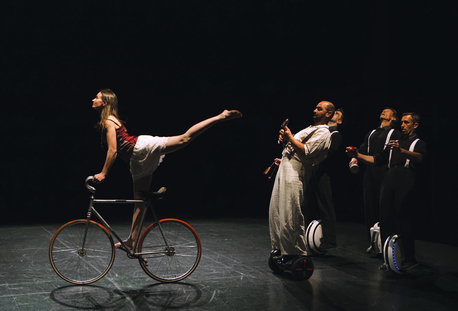 Perchés sur de curieuses roues électriques - gyropodes mono-roues - qui semblent avancer toutes seules, les Acrostiches surprennent encore et toujours. Avec cet objet moderne et profilé, ils ont ouvert un terrain d’expérimentation inédit à la mesure de leurs talents d’acrobates et de jongleurs.