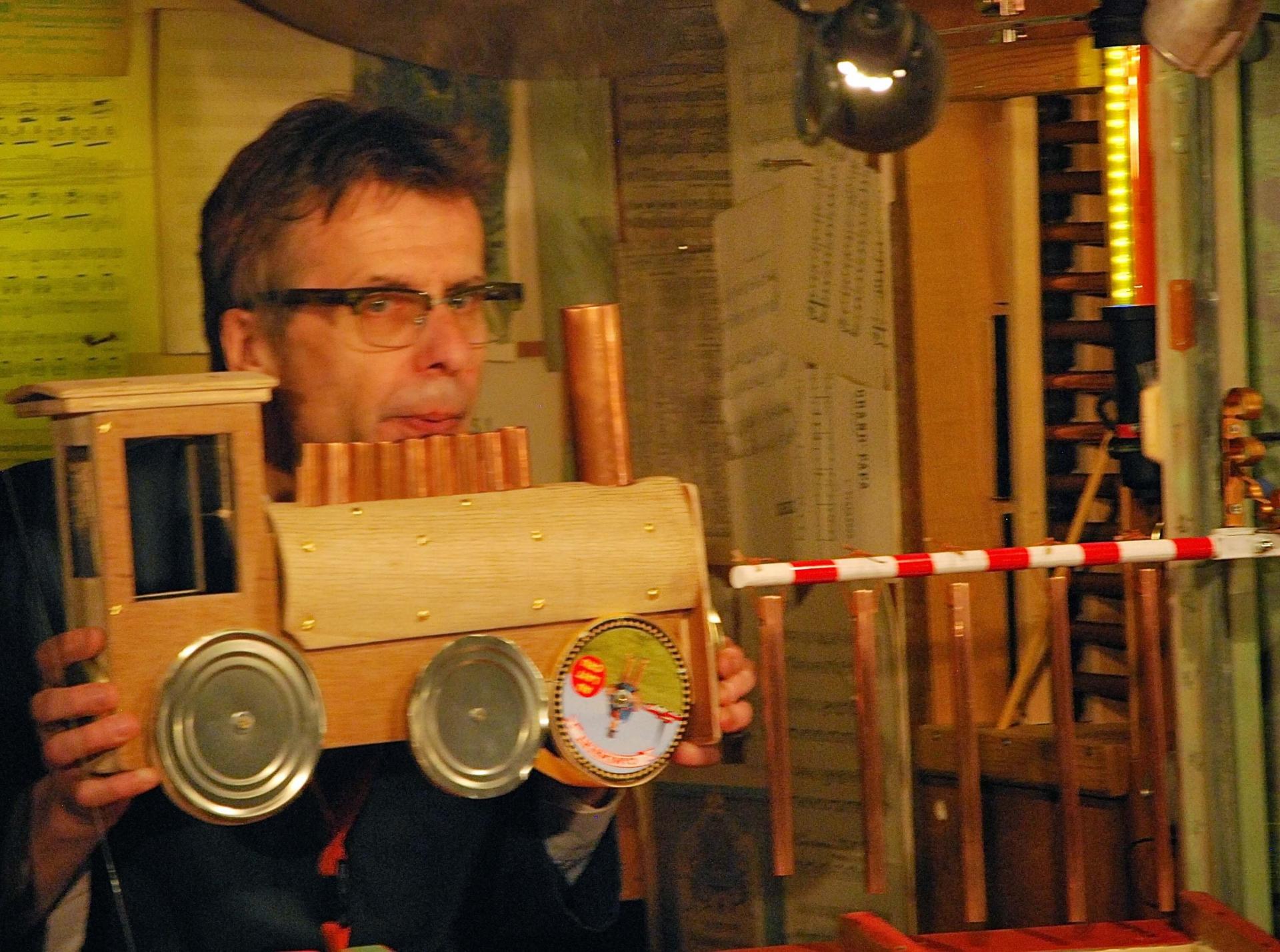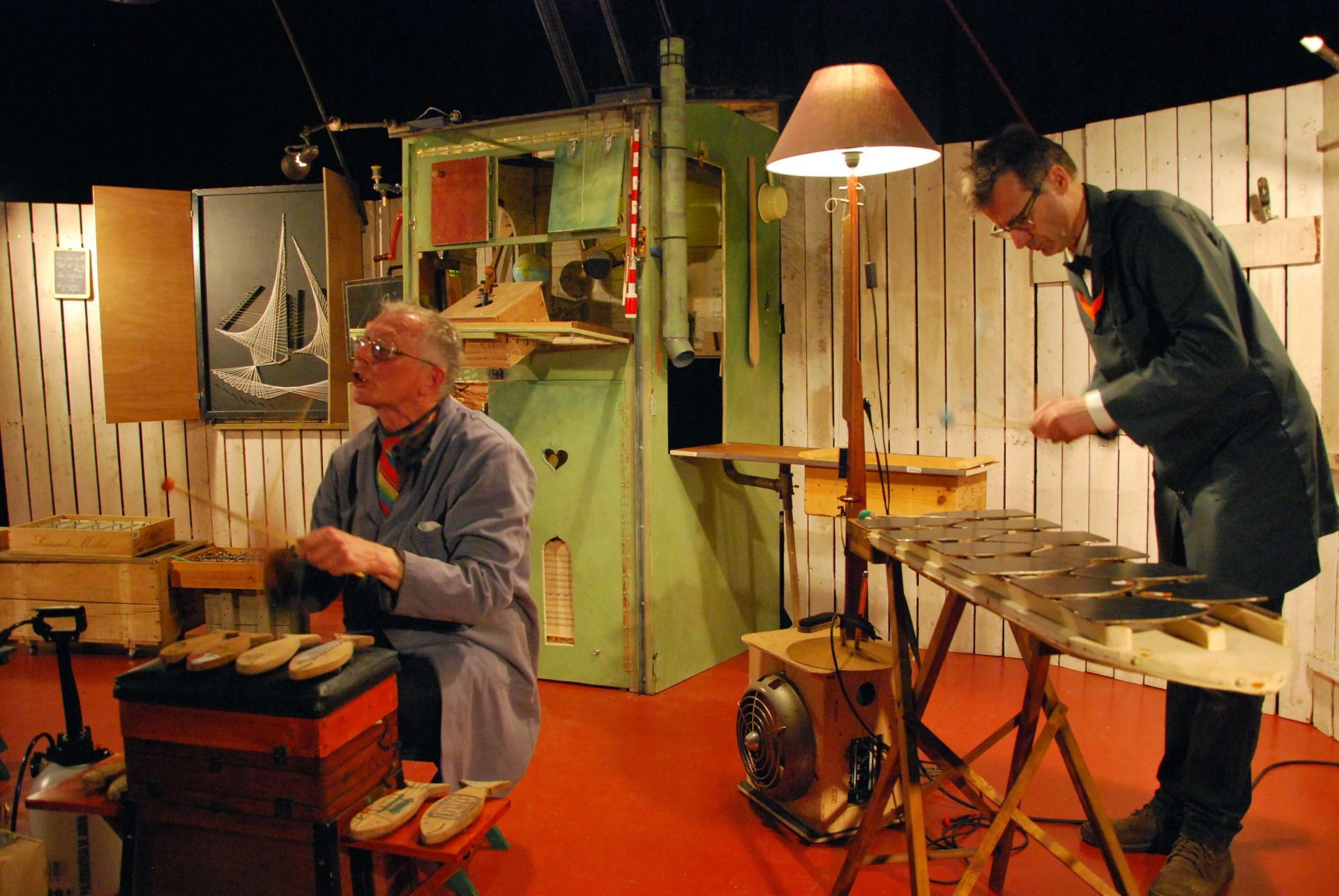 Depuis leur atelier, ces deux farfelus enthousiastes font apparaitre tout un assortiment d'objets sonores et musicaux qu'ils ont réalisés et avec lesquels il interprètent des oeuvres du quotidien.